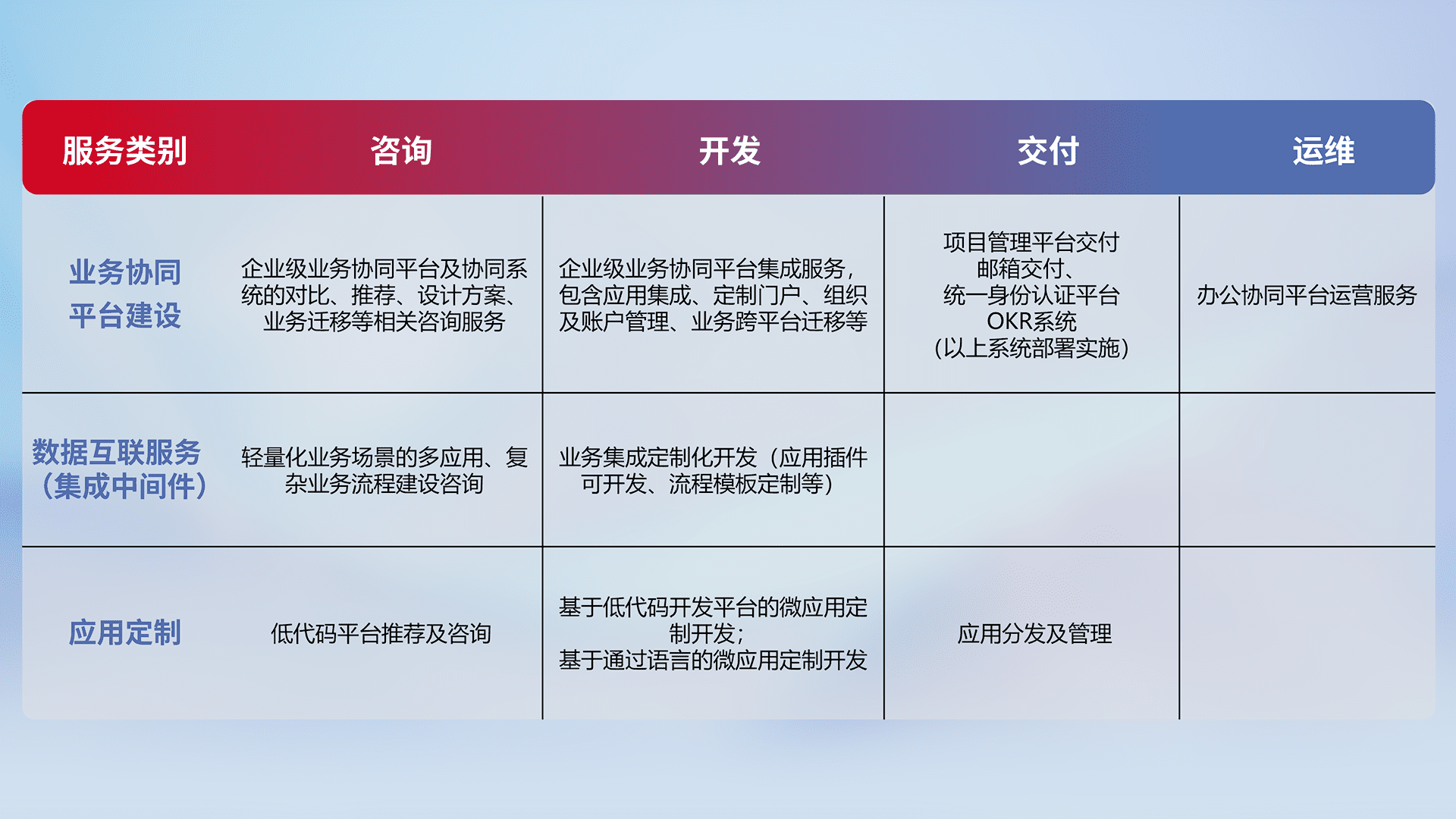 针对钉钉、、、企微、、、、IDaas等平台级产品提供产品的规划、、、方案、、交付、、、定制化开发等服务,,,实现如统一协同办公、、、、智能客户服务、、、混合会议管理、、智能数据查询、、、、等业务场景,,,实现数字化转型。。。。